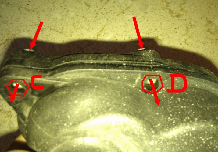1) Nie jestem mechanikiem, więc czy ktoś z szanownego koleżeństwa może mnie oświecić i wyjaśnić jakaż to tajemna myśl techniczna przyświeca zastosowanemu rozwiązaniu, w którym nakrętki A i B (zdjęcie poniżej) znajdują się pomiędzy dwoma częściami dolnej obudowy a te dwie części są sklejone/zgrzane? :zdziwko: