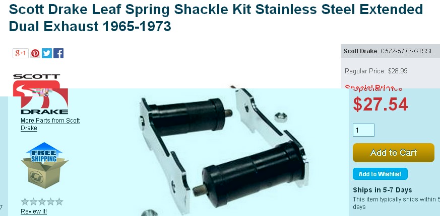 Made by Scott Drake. 1" longer than RSK14. 9/16" rubber bushings included. Features stainless steel construction. GT dual exhaust design is much easier to install than stock shackles. Does one spring. Car requires two kits.