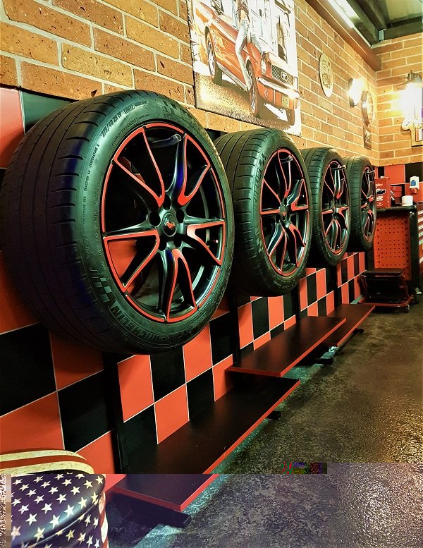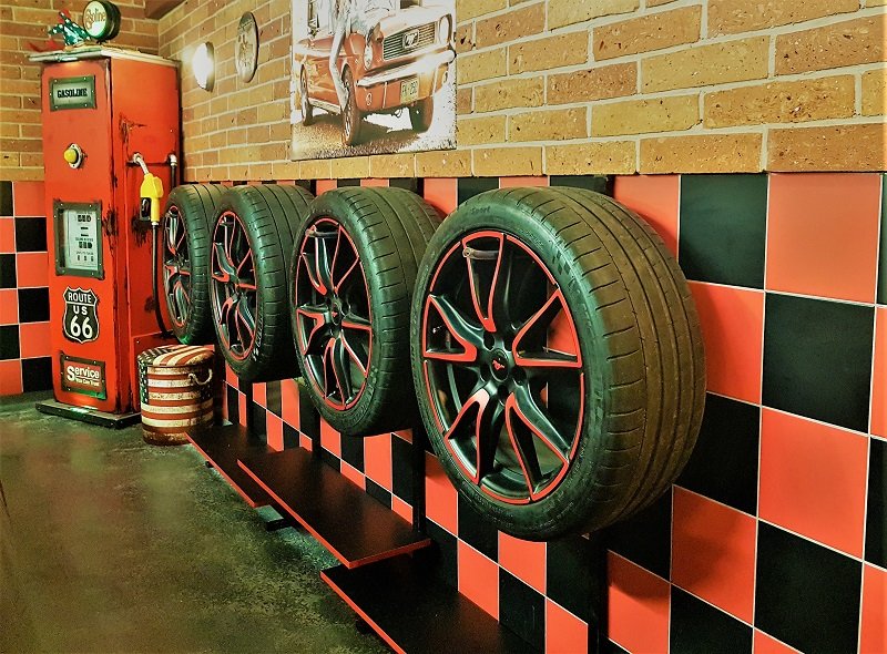 Kolejna mała zmiana. Otóż koła wcześniej składowałem jedno na drugim, ale wymagało to dodatkowego zachodu, aby je przekładać czasami, więc postanowiłem je zawiesić na ścianie. Z uwagi na zbyt słabą ścianę (płyta obornicka) nie mogłem haków zamontować bezpośrednio do ściany, więc haki zostały zamontowane do metalowego profila, a ten cały ciężar przeniósł na podłogę. Przy okazji, korzystając z wolnej przestrzeni pod kołami, zamontowałem półeczki. Teraz oprócz praktycznej strony jest również efekt wizualny, który nadaje jeszcze bardziej garażowego charakteru. A jeśli felgi są ładne to tym bardziej warto je wyeksponować.