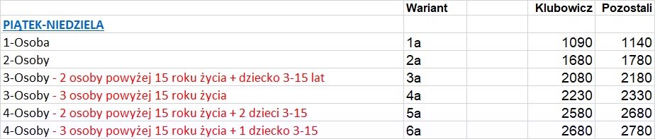 W tabeli macie podane warianty. TYLKO PIĄTEK - NIEDZIELA. Jeśli coś dla Was nie jest jasne albo Wasza obecność jest ilościowo inna niż w poniższych wariantach, lub chcecie przyjechać np. wcześniej lub zostać dłużej to piszcie na PW lub zlot@mustangklub.pl.