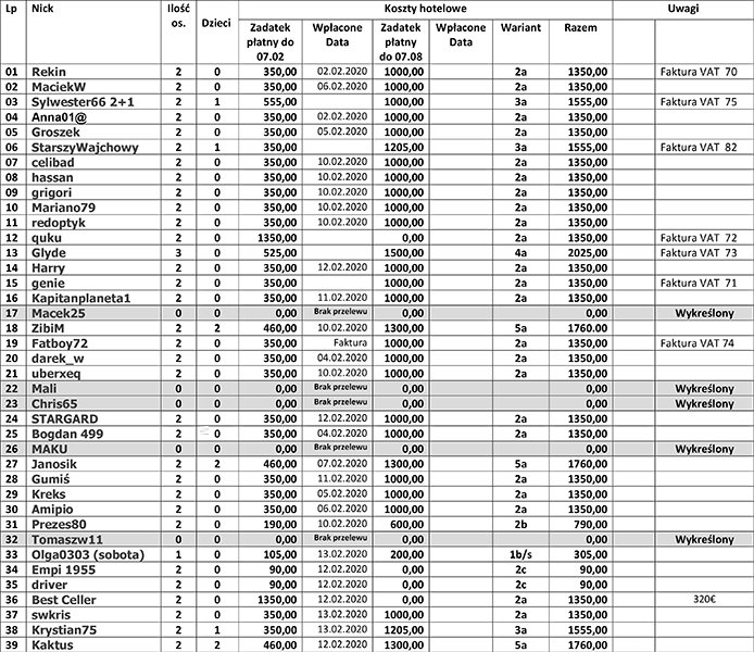 Dzisiaj otrzymałem informacje z hotelu odn. przelewów i sytuacja ma się tak jak na załączniku. Tam gdzie jest wpis: "Czekam" to Ci, którzy kontaktowali sie ze mną telefonicznie w dniu dzisiejszym i poprosili o czas do jutra. Nie mam podstaw, aby im nie wierzyć, więc przyjmuję że nadal są chętni na imprezkę. Natomiast pozostałych niestety będę zmuszony wykreślić z listy hotelowej i na ich miejsce wprowadzę osoby z listy rezerwowej. Wieczorem 11.02.2020 będzie lista zgodnie z obietnicą.