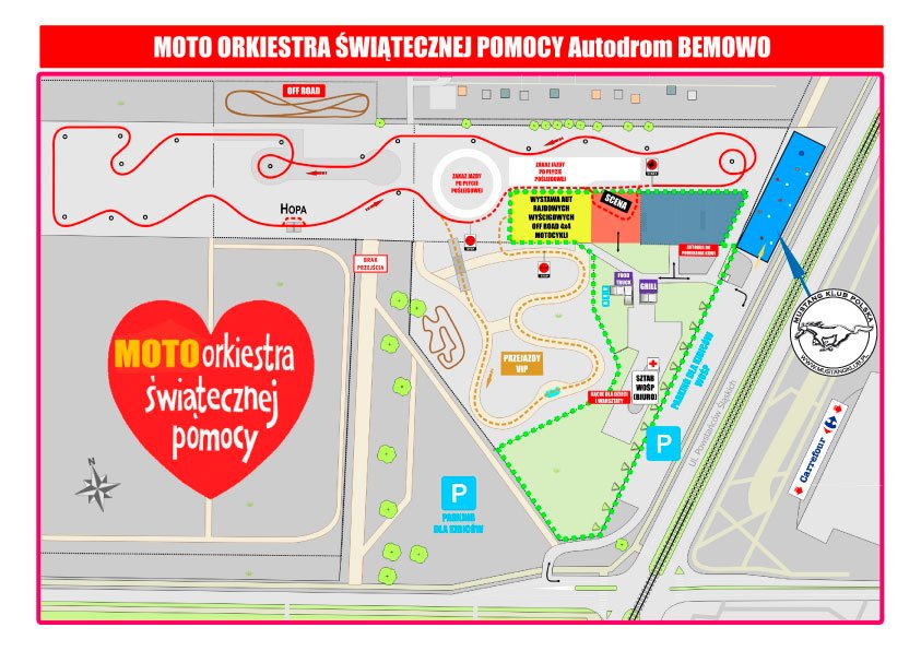 Opanujemy teren po prawej stronie przed bramą wjazdową na teren Autodromu Bemowo - fragment płyty lotniska o wymiarach 100 m x 25 m. Nasz plac pomieści własny tor do jazdy sprawnościowej (slalom, beczka na końcu, powrót), zaplecze z ciepłymi napojami i czymś na ząb oraz parking - wystawę aut. Będziemy wozić chętnych, którzy zasilą puszkę WOŚP. Tor będzie dość wolny - chodzi o zarzucanie tyłem, a nie prędkość - musi być bezpiecznie. Co pewien czas zrobimy przerwy - auta będą stygły z boku.