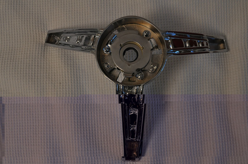Wyszło stosunkowo ładnie, a dodatkowo odnowione zostały również dwie blaszki (teraz takiej kierownicy chyba nikt nie ma :D ). Muszę dodać że na jednym z etapów odnowy wypadło jedno oczko co jest widoczne na zdjęciu od tyłu. Teraz zastanawiam się jak to pomalować (tj czarne kółeczka we wgłębieniach), chyba zmatowić i jakiś czarny półmat? Dodatkowo zastanawiam się czy brak dwóch bolców na plastikowym pierścieniu (również widoczne na zdjęciu kierownicy sfotografowanej od tyłu) wpływało na słabo działający klakson? Pewnie kiedyś to wymienię...