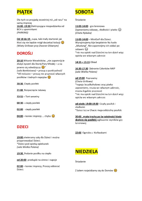 Mamy nadzieje, że pogoda dopisze i nie będzie padać ani bardzo zimno – ale proszę się w razie czego zaopatrzyć w cieplejsze ubrania i parasole …. choć jak będzie padać , to przejdziemy do planu „B” a więc imprezka w Chacie z baaardzo okrojoną grą terenową, w zasadzie nie-terenową a stacjonarną , no chybna że deszcz nam nie będzie przeszkadzać – zobaczmy. Weselnicy to fajna ekipa, więc na pewno coś wymyślimy aby się nie nudzić.
