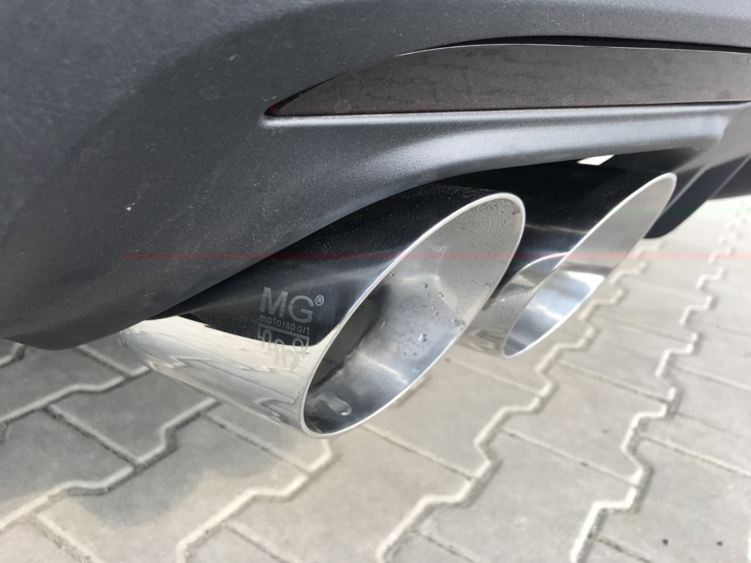 Kompletny cat-back z h-pipe, rury 2,75" wewnątrz, 2 rezonatory i 2 tłumiki końcowe z klapami sterowanymi podciśnieniem, pilot radiowy ELMES do sterowania włącz/wyłącz, cztery końcówki fi 100 mm. Cała elektronika z przodu auta.
