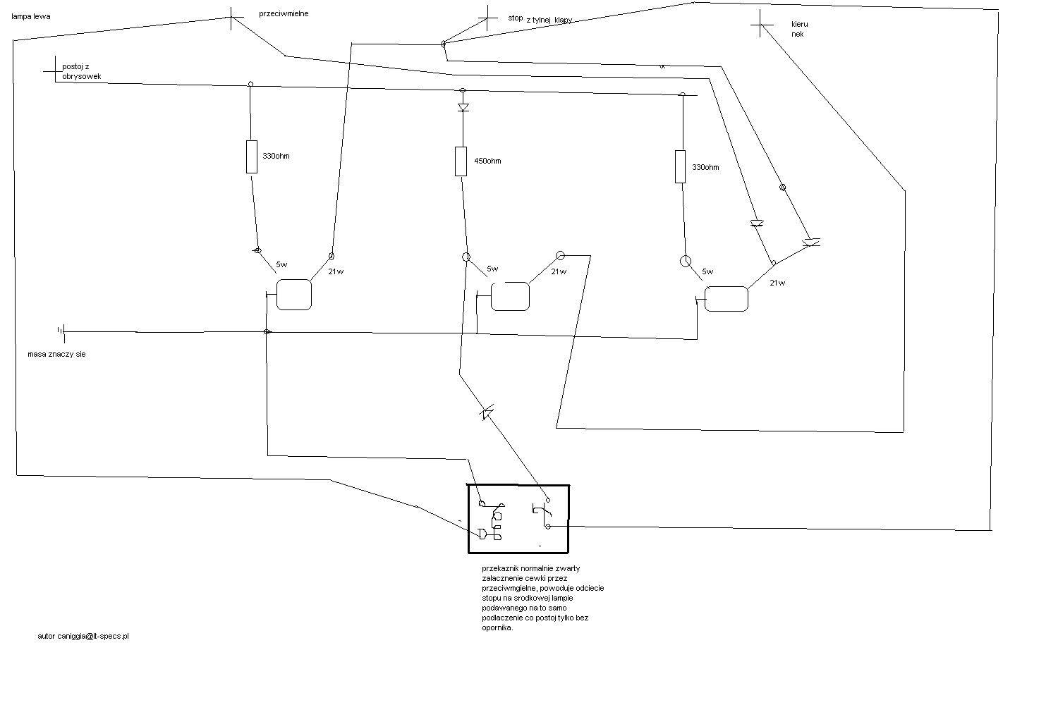 Przeróbka na bazie schematów caniggia (dzięki, były bardzo przydatne!). Zrobiliśmy jednak trochę inaczej. Z przodu dołożone rezystory po pare kiloomów, wtedy postój świeci i kierunek miga normalnie.