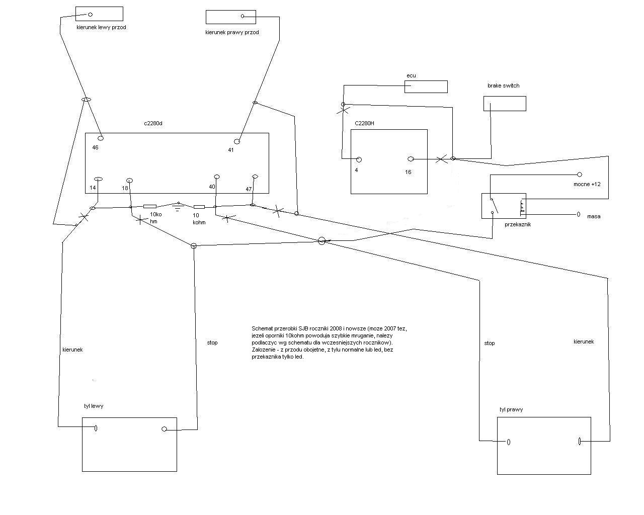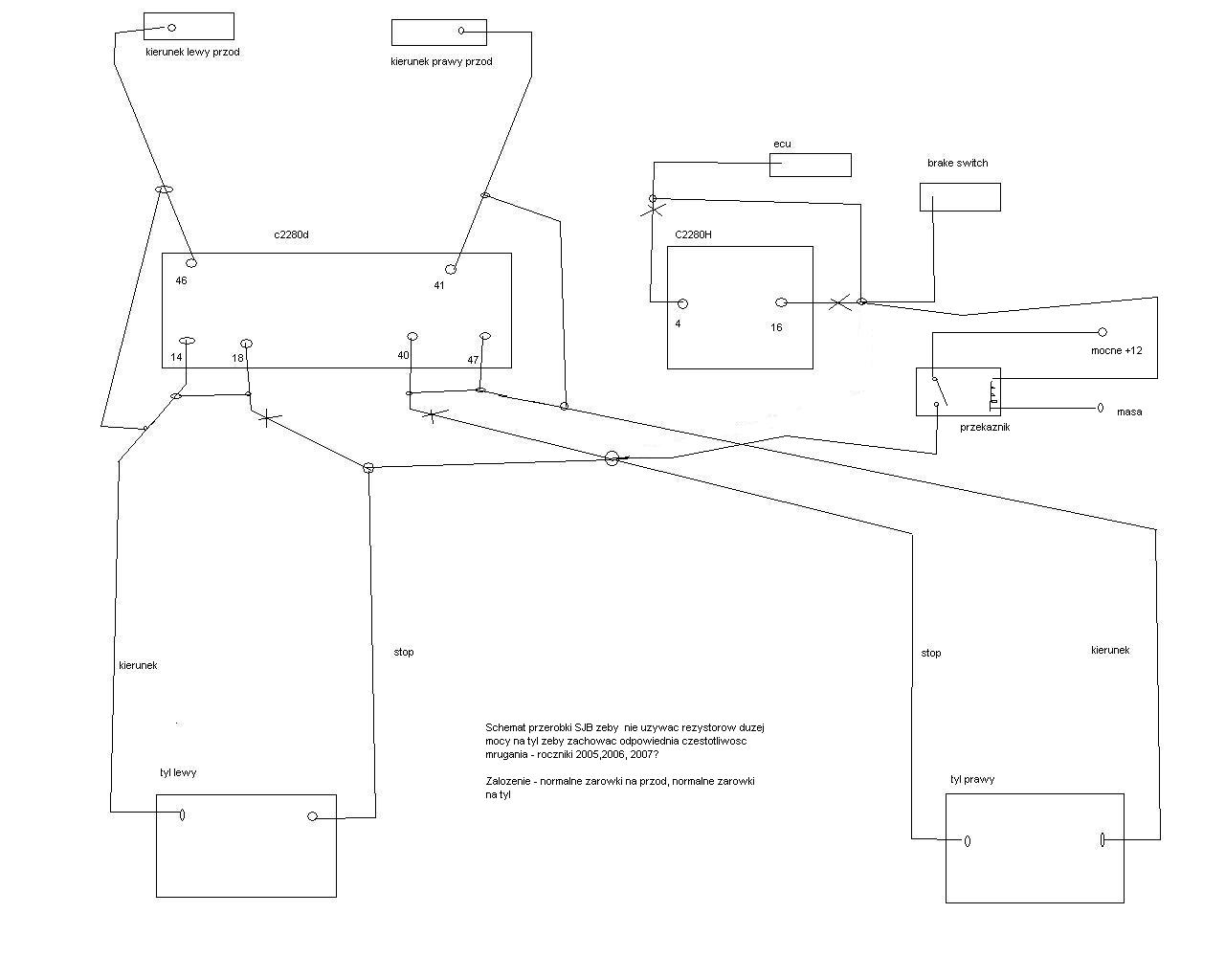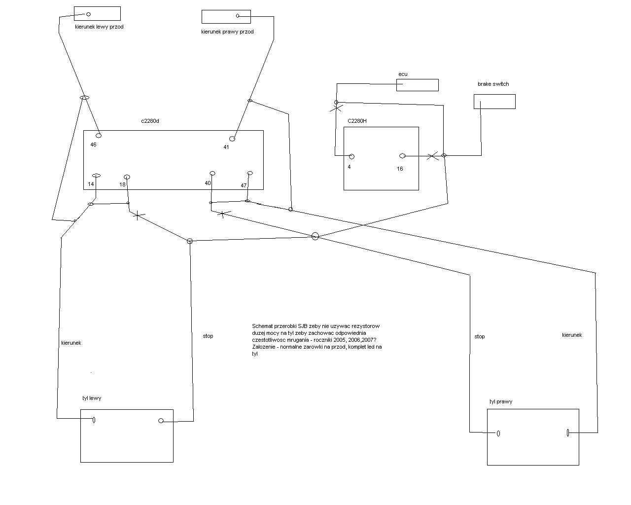 Przerobka SJB dla wariantu normalne zarowki w kierunkach przednich, tak aby nie uzywac rezystorow duzej mocy, cala przerobka jest bezposrednio przy dwoch wtyczkach SJB oraz bezposrednio przy lampach. Zalaczylem kilka schematow w zaleznosci od wariantu.