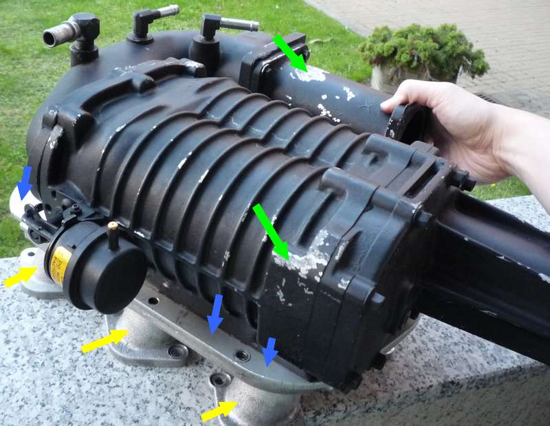 Po zamontowaniu wszystkiego, samego kolektora (żółte) nie będzie widać, więc zostanie bez lakieru. Górna część adaptera pomiędzy kompresorem a kolektorem (niebieskie) będzie widoczna i po przykręceniu do kompresora polakieruję ją na czarny mat, podobnie jak uszkodzenia lakieru (zielone). Nie chce mi się bawić w usuwanie lakieru z kompresora a poza tym lubię mat ;)