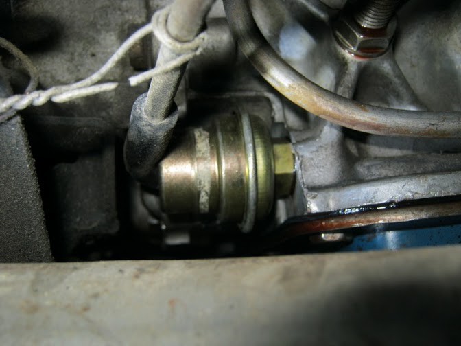 Jeszcze wrócę do tematu wycieku - sporo oleju ze skrzyni poszło w międzyczasie, więc postanowiłem to dokładnie sprawdzić. Całe szczęście nie cieknie z połączenia silnika ze skrzynia i nie będzie trzeba rozbierać, ale sączy się z kilku miejsc - spod modulatora, z rurki miarki, i z miejsca jak na załączonym zdjęciu - dobrze mi się wydaje, że to regulacja taśmy i nie bardzo jej należy ruszać?