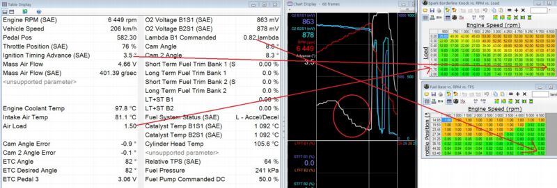 Drugi screen z loga pokazuje (prawie wszystko, bo nie nagrał mi się afr), ale ten był na poziomie 11.4, gdzie zaprogramowany jest 12.00 (lambda 0.82), co powoduje nic innego jak stratę z 20 koni i zwiększone zużycie paliwa niepotrzebnie. Na szczęście jest minięty w stronę nie powodującą uszkodzenie silnika.