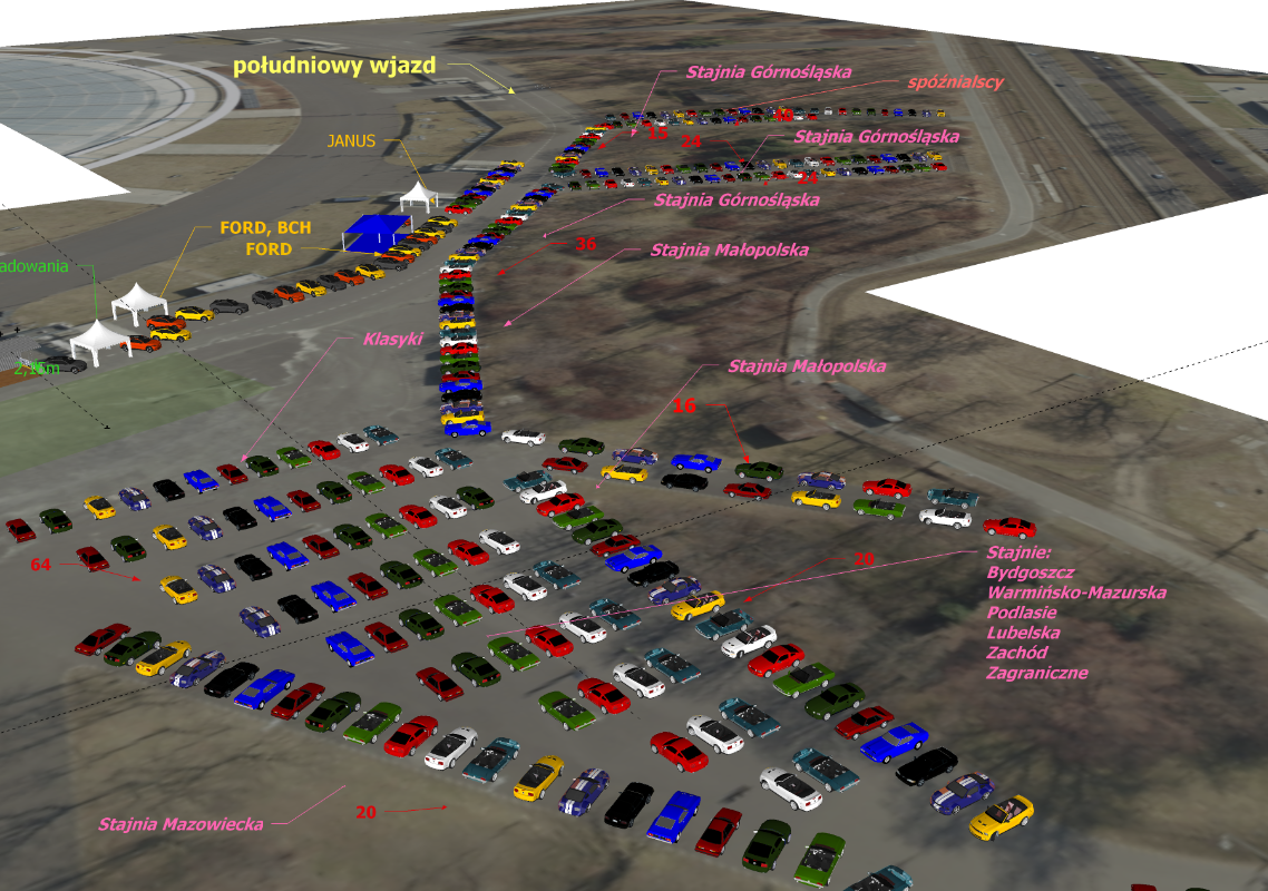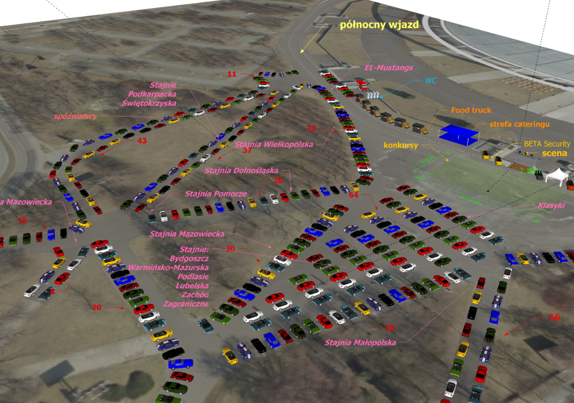 Na bramkach będą obecne osoby, które będą wpuszczały Mustangi i kierowały dalej (dzięki temu nie będzie konieczne pobieranie biletu wjazdowego).