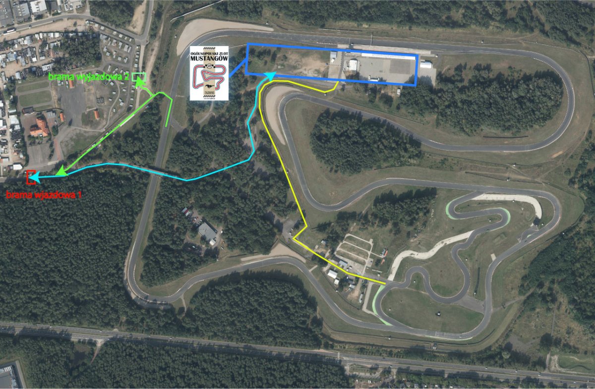 Proszę ustawiać się na części trawiastej, która się konczy stoiskiem Ford Polska łatwo widocznym i nie wjeżdzać do końca na plac z kostką brukową. Na tym placu będziemy formować grupy na tor po zarejestrowaniu kierowców.