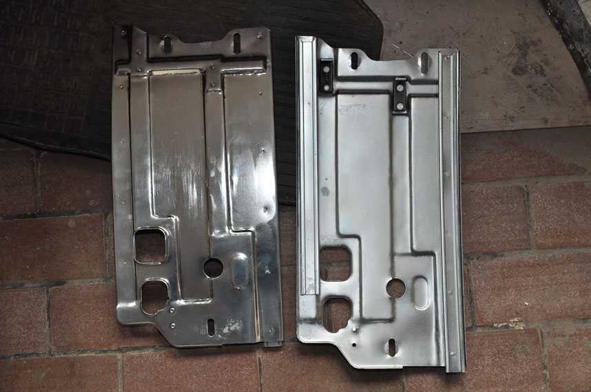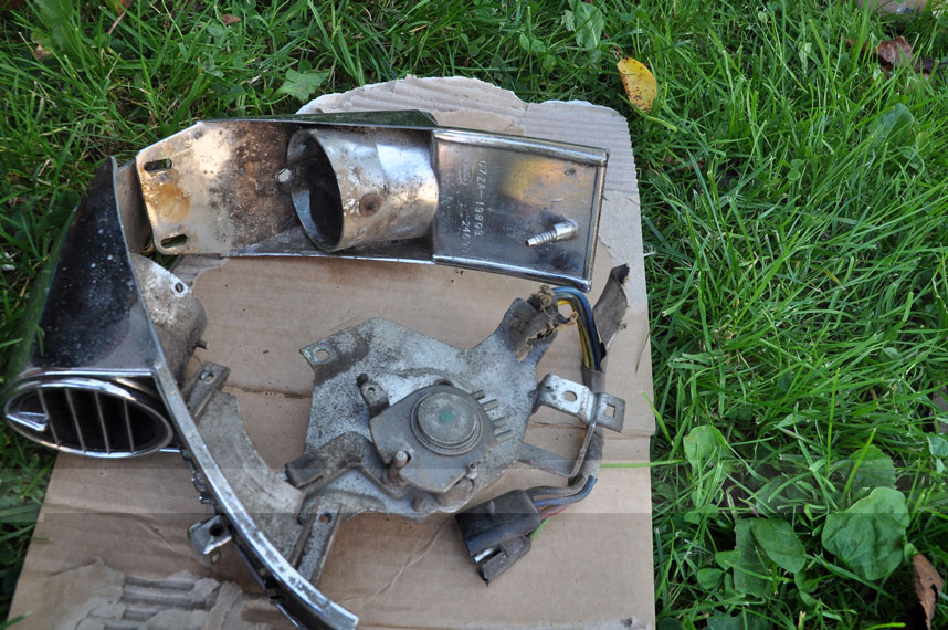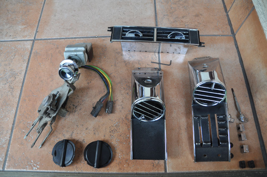 tymczasem dostałem klameczki z innego galwana, który lepiej zadbał o szczegóły, a ja w międzyczasie w końcu zrobiłem coś sam - wyczyściłem nawiewy od klimy (chromowanie ich nie miało większego sensu, gdyż była obawa o ich ponowne pokrycie odpowiednią czarną farbą i o elementy skórki które są do nich przyklejone) i przygotowałem wstępnie blachy z okienek pod ocynk: