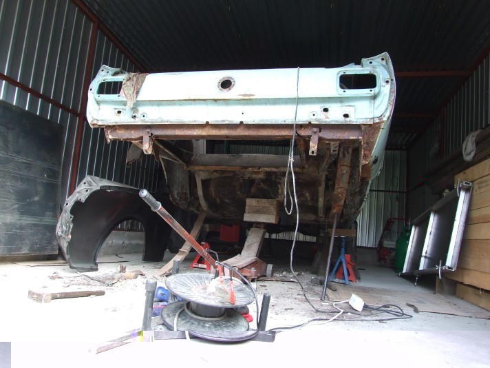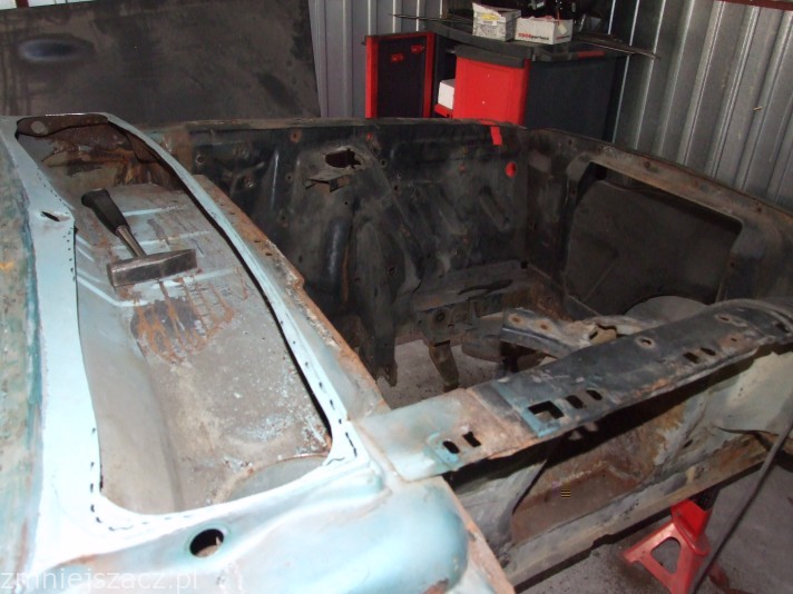 Pracę wznowie zimą_ piaskowanie + malowanie reaktywnym podkładem jak będzie trochę cieplej położę lakier (wszystko robię sam dlatego to tak wolno idzie) potem konserwacja progi , profile , nadwozie.Potem wyposażenie wnętrza i na końcu silnik (mam nowy).Od zrobienia tych zdjęć trochę się zmieniło , byłem zdziwiony wagą karoserii wynieśliśmy go w 3 osoby.