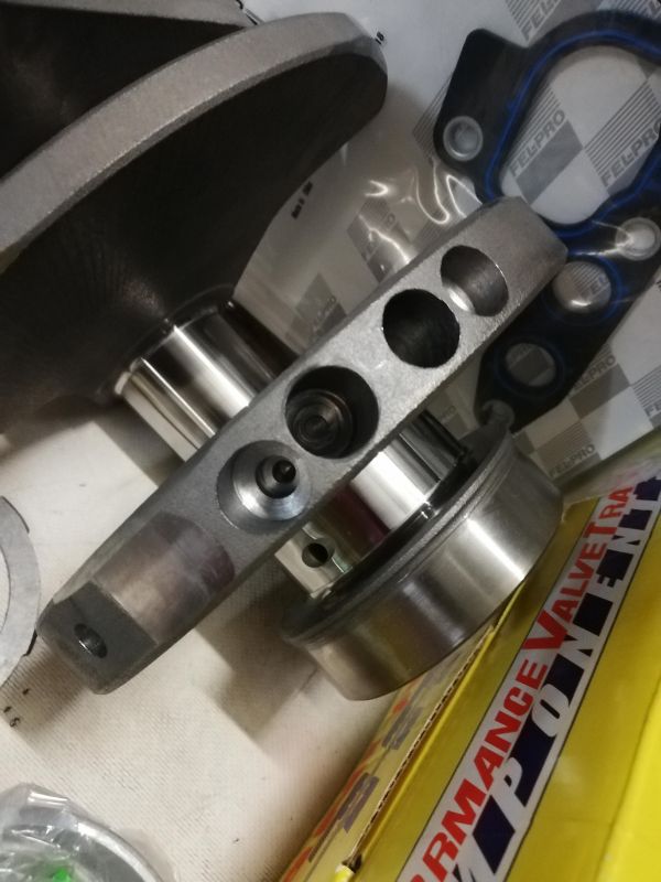 Ciężko w USA coś znaleźć na pierwszy szlif, więc poszedł drugi. Do tego osiowanie i planowanie bloku, nowe tuleje. Fabryczny wał jest kuty, ale jak już robić to od początku do końca. Nowy, kuty wał na 5.0, kute korby, kute tłoki, pierścienie, tuleje, panewki.. Podnosimy kompresję. Pompa oczywiście high volume. Uszczelki Cometic, śruby korb, podpór wału, boczne podpór, wszystko ARP - to chyba najbardziej zaskakująca pozycja jeśli chodzi o koszty. Oczywiście zaskakująca negatywnie. Zestaw wyważony w całym komplecie z kołami pasowymi, masowym i sprzęgłem.