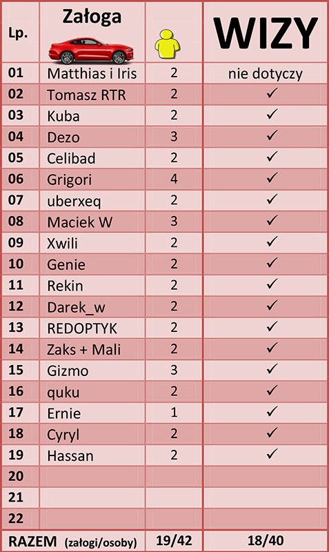 Pragnę poinformować, iż pierwszy etap za nami. Udało się zebrać od wszystkich uczestników dane do zaproszeń. Przesłałem wszystko Kubie. Łącznie jedzie 19 załóg (42 osoby)