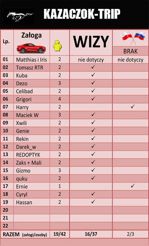 Pragnę poinformować, iż pierwszy etap za nami. Udało się zebrać od wszystkich uczestników dane do zaproszeń. Przesłałem wszystko Kubie. Łącznie jedzie 19 załóg (42 osoby)