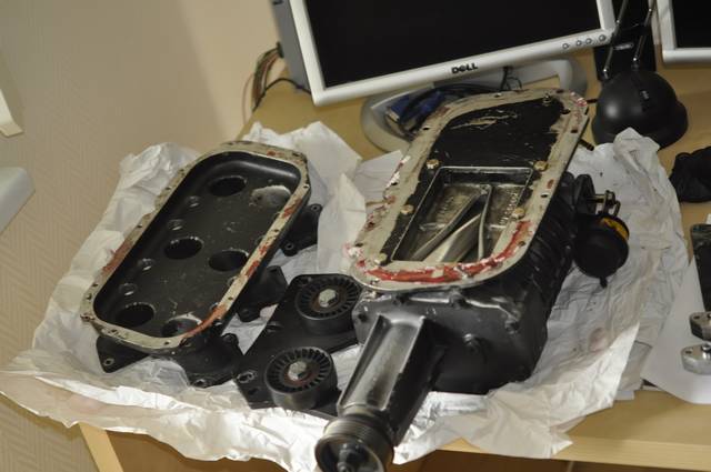 Tutaj widać jak ciołek ze Stanów polakierował wszystko na czarno - włącznie z kolektorem dolotowym po obu stronach! W niektórych miejscach farba poodpryskiwała - fajny syf musiał mu lecieć do silnika... Na pewno kolektor (to po lewej) i jego pokrywę, która jest teraz przykręcona do sprężarki będę czyścił - jak nie pójdzie rozpuszczalnikiem, to wypiaskuję. Sam kompresor chyba zostawię czarny i ewentualnie uzupełnię odpryski lakieru...