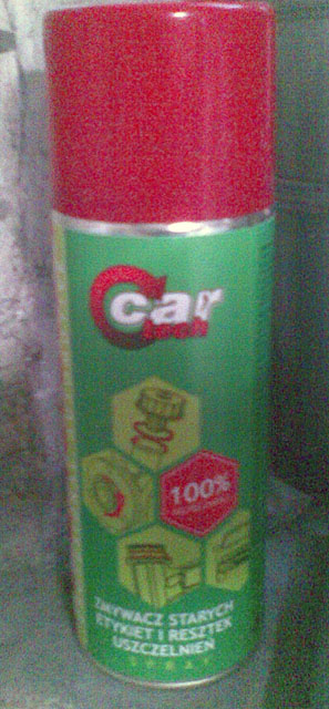 - Nie bawić się w żadne podgrzewanie pasów. Zdejmować na zimno, ew. sprayem (fota niżej) potraktować. Powoli, ale siły sporo trzeba. Kleju zostanie niewiele.