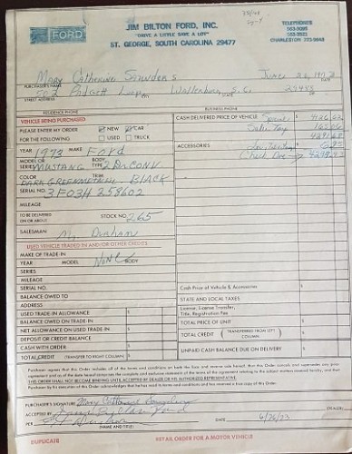 Znalazła się teczka z dokumentacją. Dużo rachunków za naprawy i zakup róznych częsci oraz badania techniczne. Ale jeden z dokumentów jest szczególnie ważny, bo to faktura zakupu. Nawet podjąłem próbę nawiązania kontaktu z wnukami pierwszej właścicielki, ale niestety bez odzewu. Pierwszą właścicielką była Pani Mary Chase Saunders, która kupiła auto 26.06.1973r. w salonie Forda. Niestety Mary już nie żyje. Zmarła w grudniu 2017r. w wieku 91 lat. Taką informację znalazłem w internecie na stronie domu pogrzebowego, w którym odbyła się konsolacja.