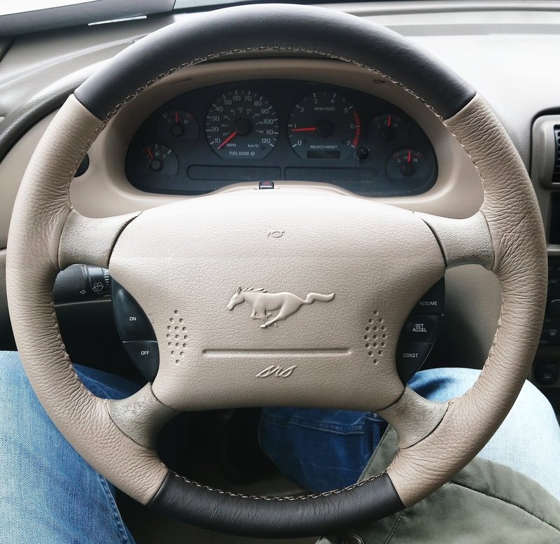 W miniony weekend odebrałem wreszcie kierownicę z renowacji. Skóra została fantastycznie dobrana kolorystycznie i niesamowicie uszyta. Dodatkowo fachowiec ze Stęszewa (firma Skóro Styl) zdecydował się na kontrastową złotawą nić, która nie rzuca się w oczy a wygląda bosko! Na pewno jeszcze nie raz do niego zajrzę, bo mam w głowie mnóstwo pomysłów na urozmaicenie wnętrza Mustanga (już teraz myślę o hafcie z nazwą modelu na zagłówkach). Dodatkowego smaczku nadały nowe, beżowe dywaniki, które zastąpiły zmęczone życiem oryginały. Kierownica zamontowana, jazda próbna wykonana (słońce przez lwią część weekendu sprzyjało) i teraz mogę już planować kolejne wydatki. Na pewno niedługo znikną chińskie pseudoksenony zamontowane przez poprzedniego właściciela i wrócą normalne żarówki. Przy okazji spoleruję sobie reflektory i wymienię tylne kierunkowskazy na pomarańczowe LEDy, żeby bezstresowo przechodzić badania techniczne.