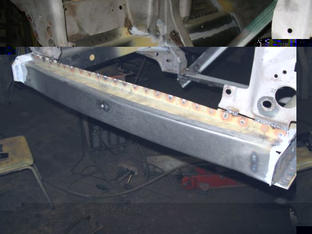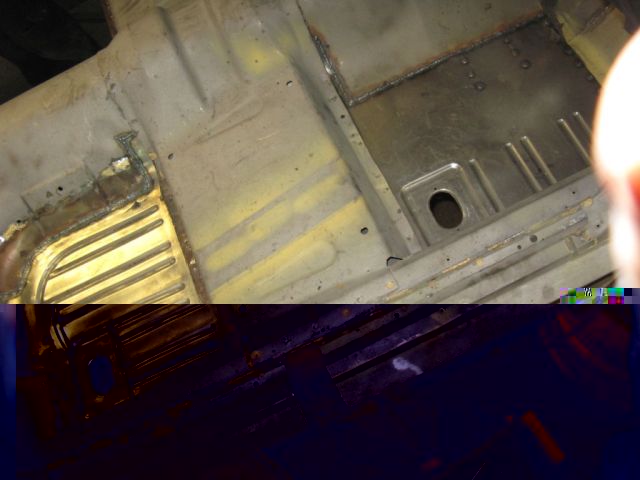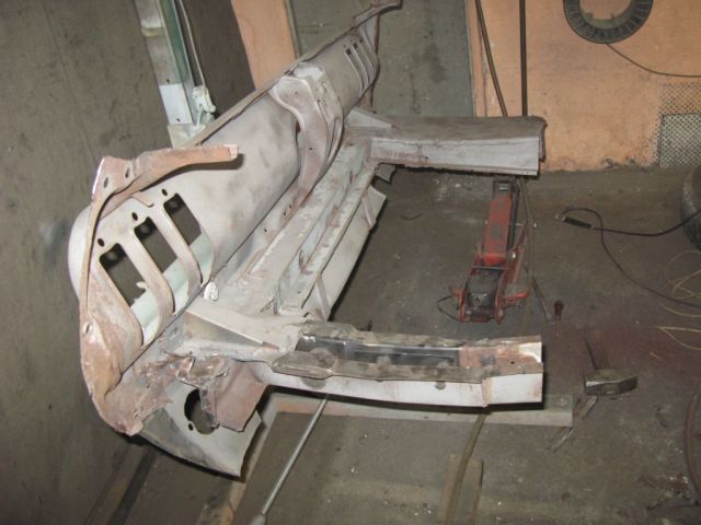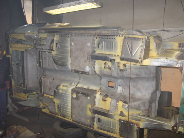 Ale do rzeczy. Nadwozie otrzymaliśmy w stanie raczej nie rokującym na nic. Niby sie trzymało kupy ale tylko dlatego gdyż było zbudowane przy użyciu wszelkiego rodzaju półproduktów hutniczych. Po wycięciu wszystkiego okazało się, że mamy tylko zdrową ramę szyby wraz podszybiem, kominami (!!!) i z słupkami A, zdrowy tunel oraz dwa odcinki tylnych podłużnic, takie po 30 cm.