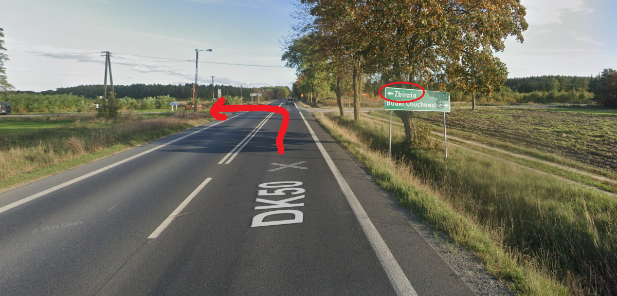 - mapa1/4 – zjazd z trasy głównej na boczną ulicę prowadzącą na teren zlotu